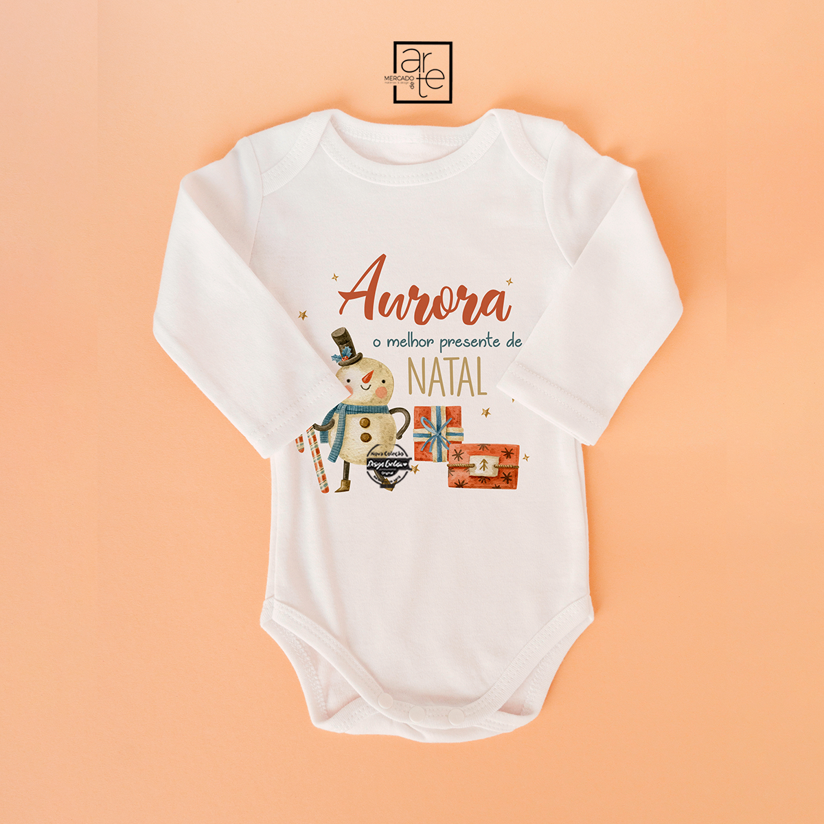 Body "Boneco de Neve - Feliz Natal", disponível nos tamanhos 0-3 meses, 3-6 meses, 6-9 meses e 9-12 meses.
