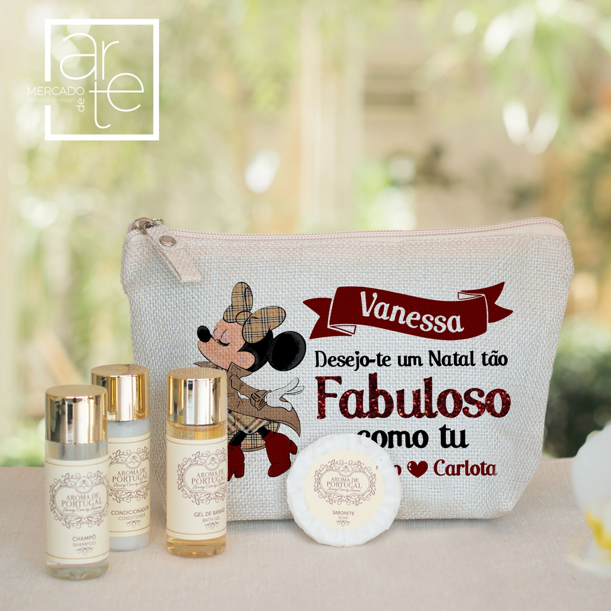 Bolsinha tipo linho personalizada por si. Kit inclui em tamanho de viagem um champô, um gel de banho, um condicionar e um sabonete.