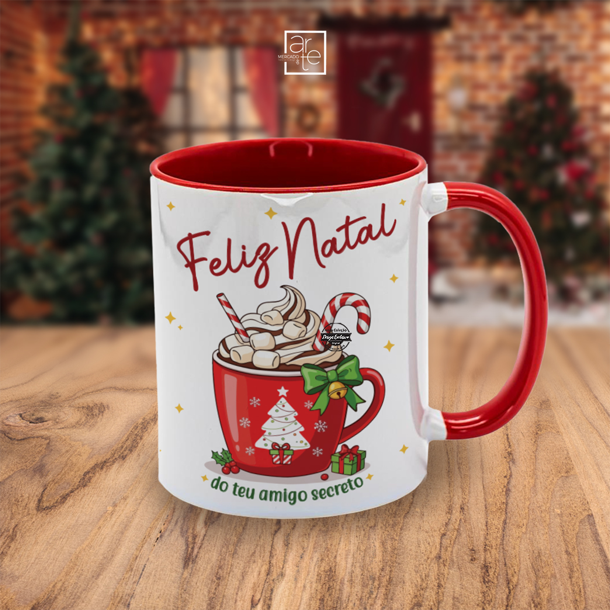 Caneca com asa e interior vermelho Feliz Natal "Amigo secreto", pensada para transmitir alegria, carinho e boas energias!