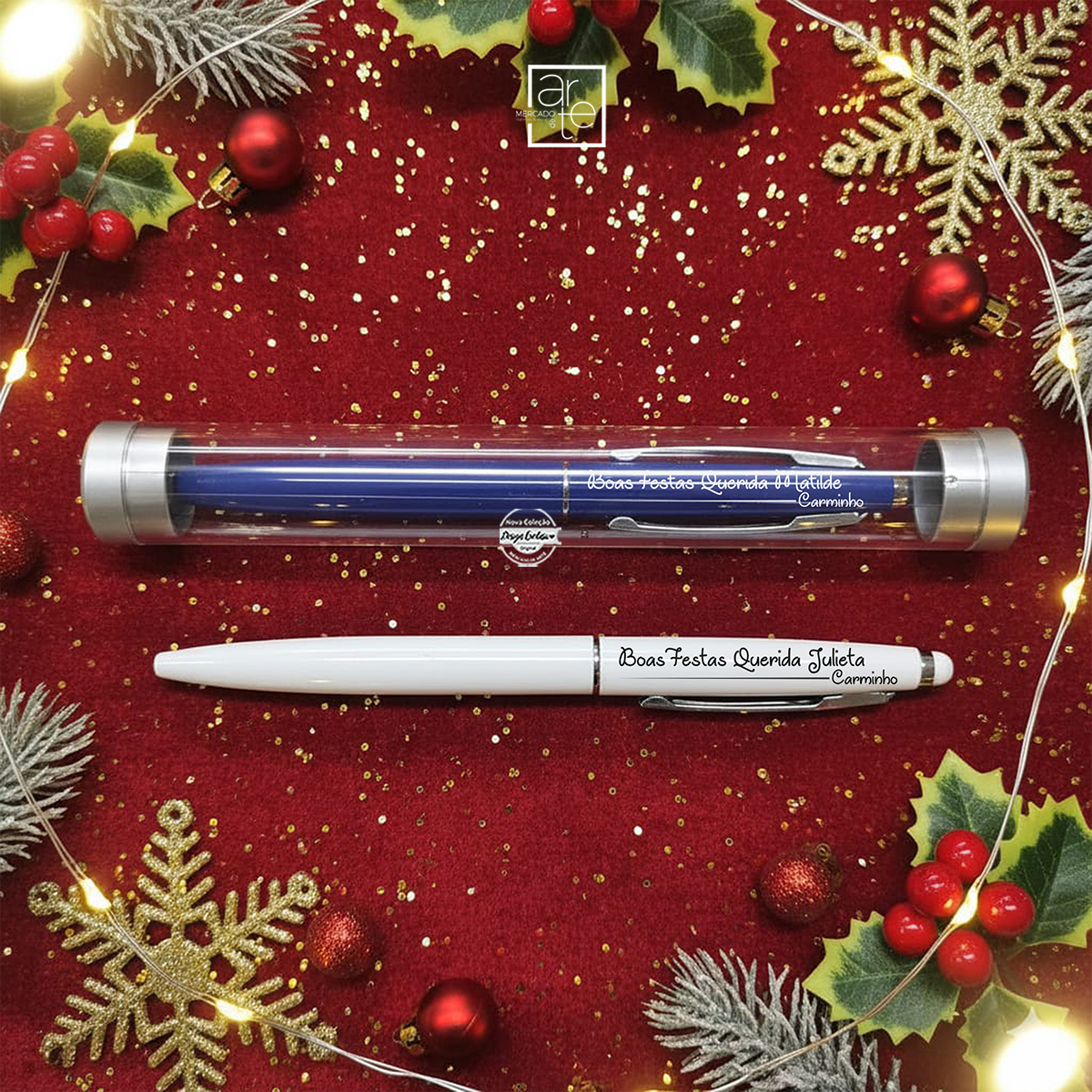 Caneta com tubo "Boas Festas", personaliza com nome e/ou pequena frase que desejares. Caneta disponível em branco ou azul.