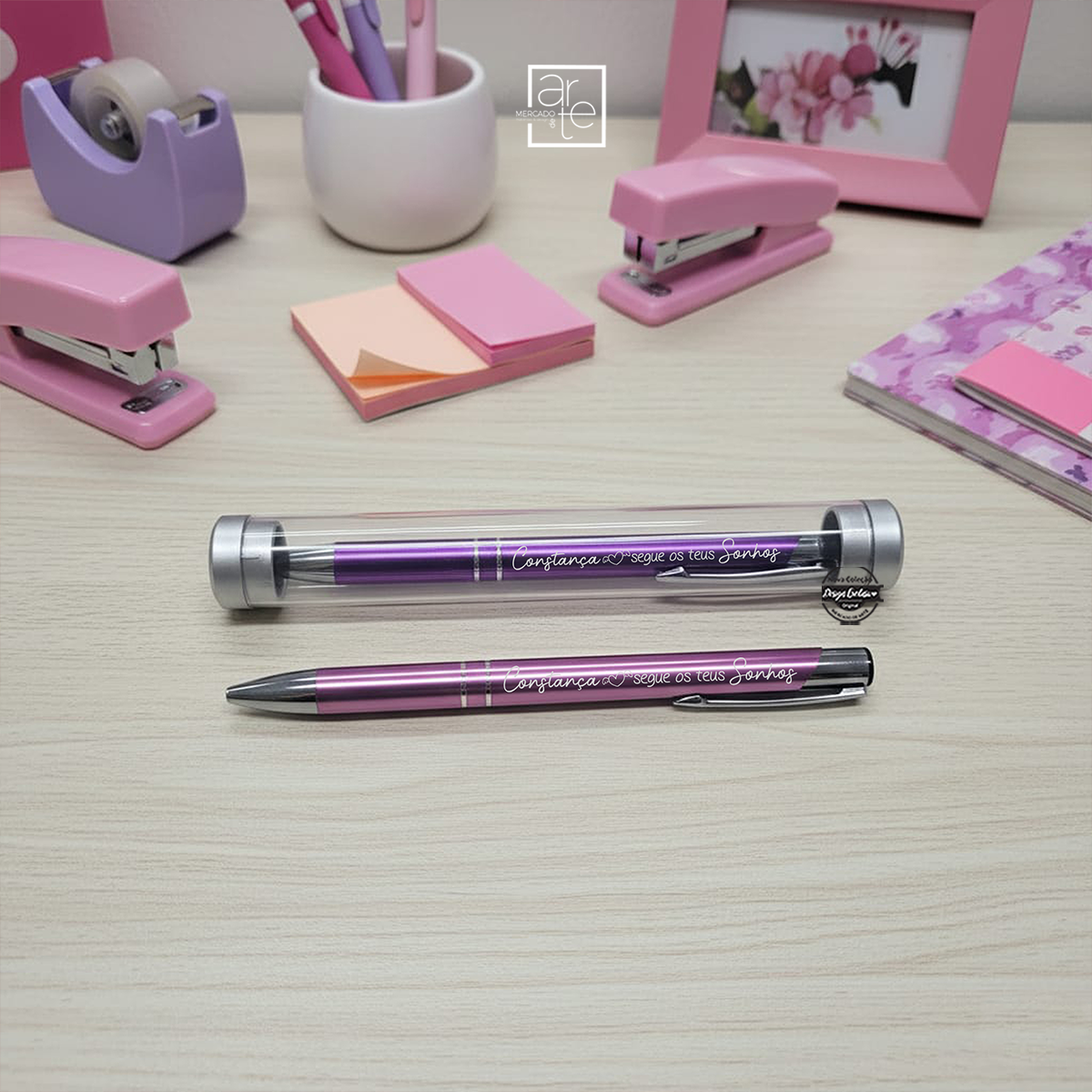 Caneta com tubo "Segue os teus sonhos", personaliza com nome e/ou pequena frase que desejares. Caneta disponível em rosa, roxo, azul, branco e preto.