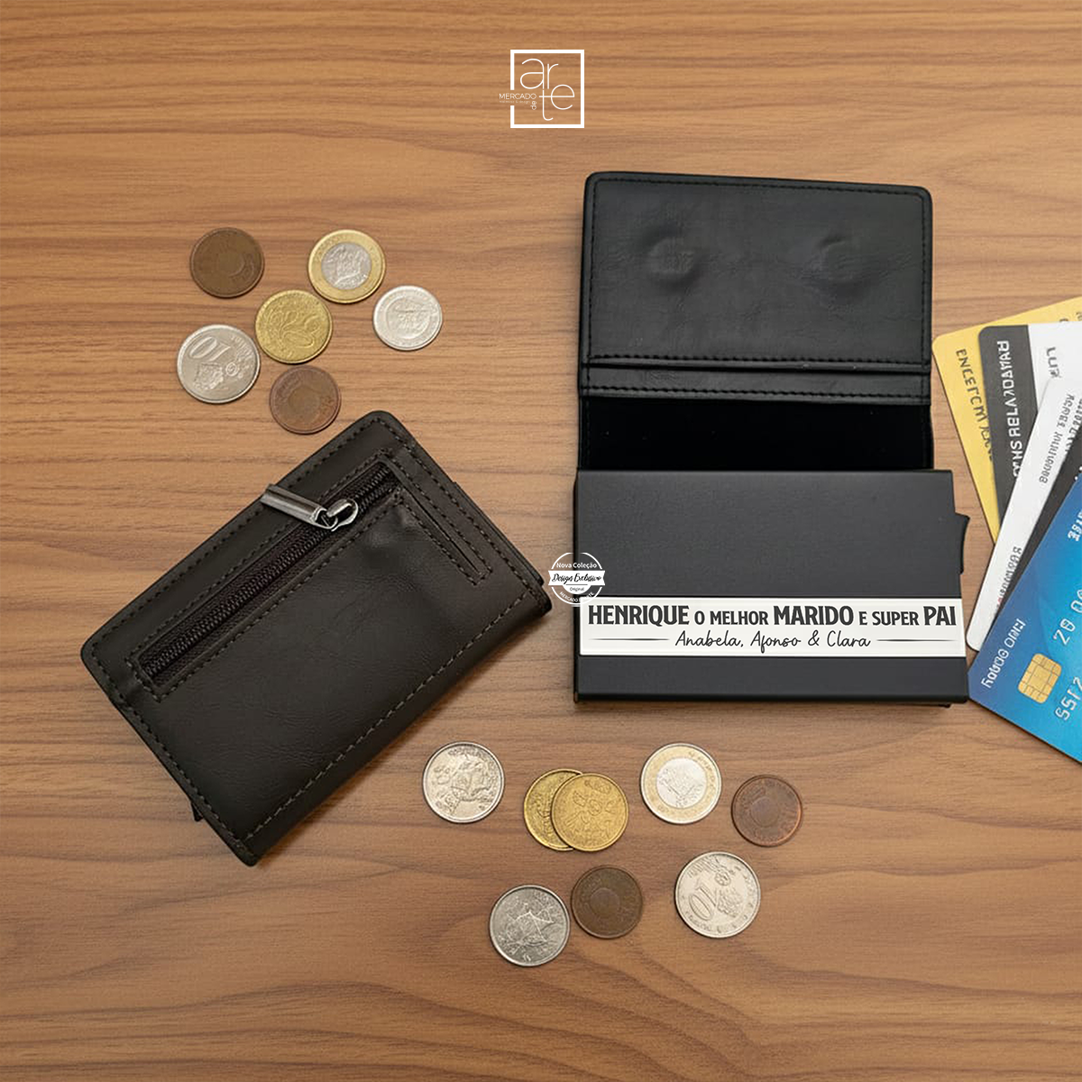 No interior, conta ainda com compartimentos para notas, dois compartimentos adicionais e uma bolsa para moedas. Personalize com pequena frase que desejar.