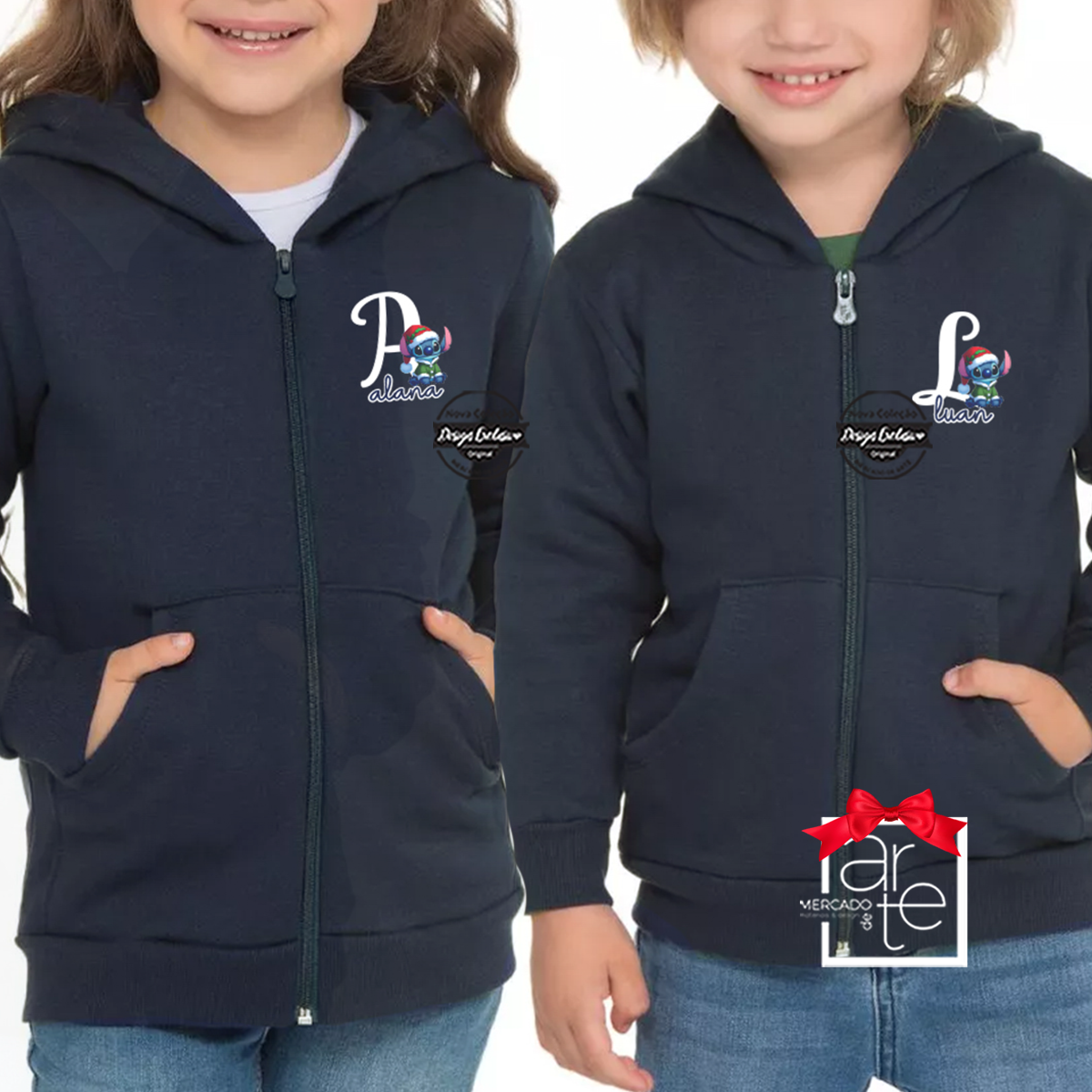 Um casaco de fecho super quentinho, com interior cardado a 280g, feito para garantir conforto e estilo. Personalize com a inicial da criança num design que eles vão adorar com o stitch com barrete de natal.