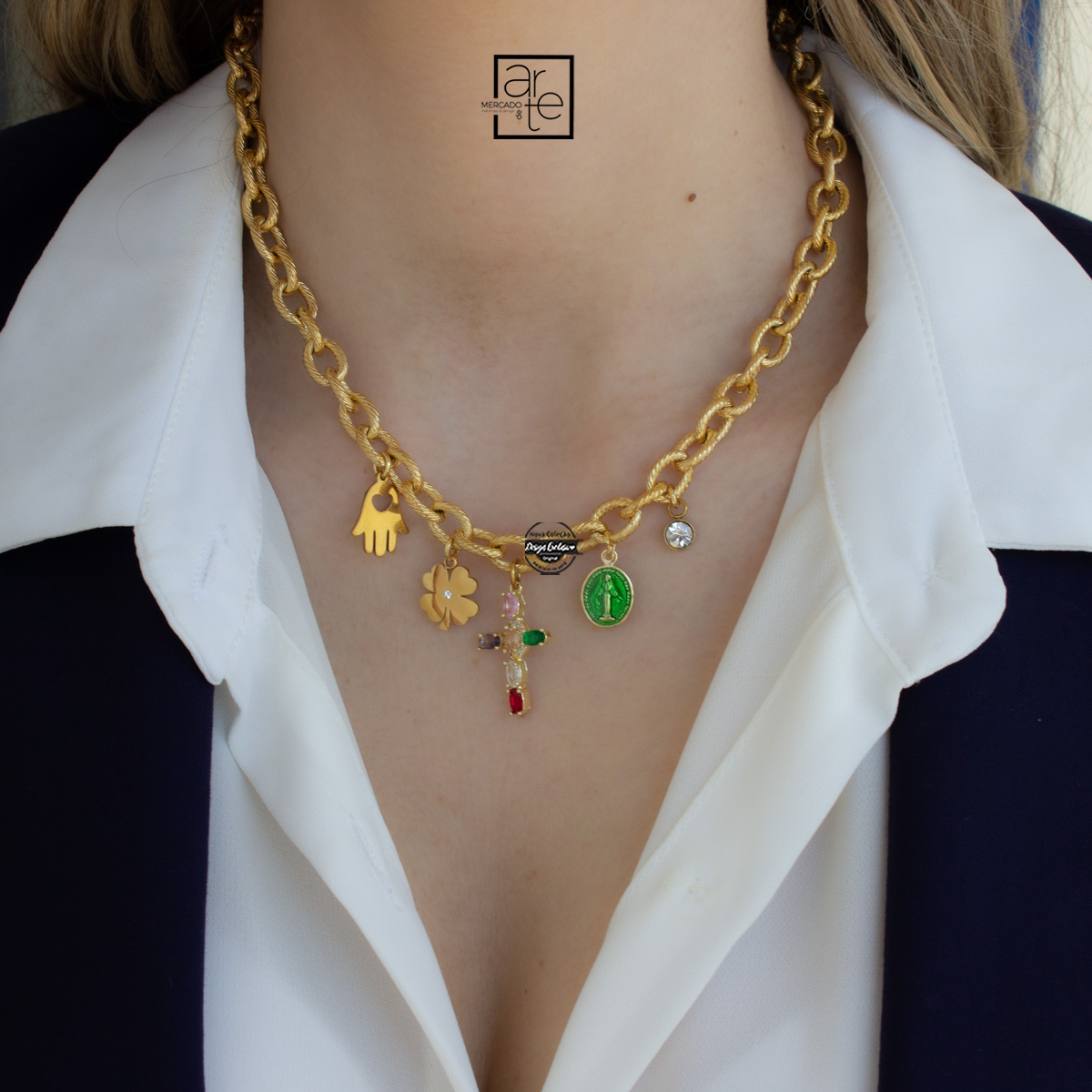 Fio em aço inoxidável dourado com uma cruz de zircónias coloridas e pendentes de amuletos de proteção e sorte.