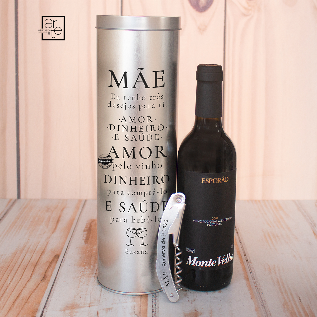 Conjunto garrafa de vinho com lata e saca rolhas "Mãe eu tenho três desejos para ti AMOR, SAÚDE e DINHEIRO! Amor pelo vinho, dinheiro para comprá-lo e saúde para bebê-lo", o presente perfeito para celebrar momentos especiais com a melhor mãe do mundo.