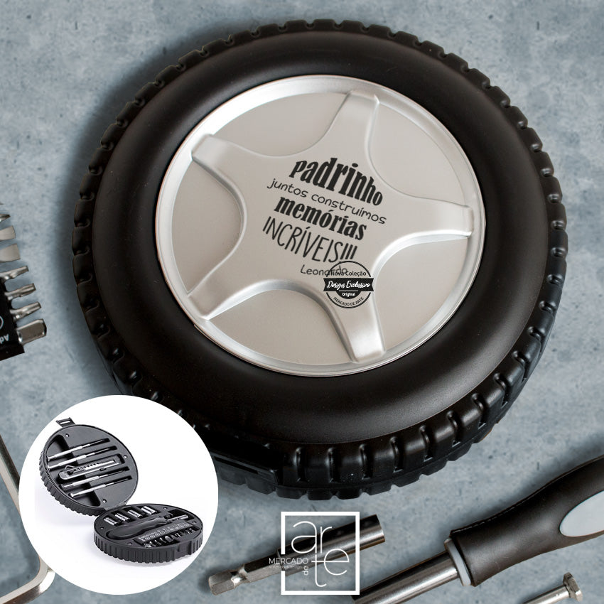 Conjunto de ferramentas em forma de Pneu de 20 acessórios em estojo resistente.
