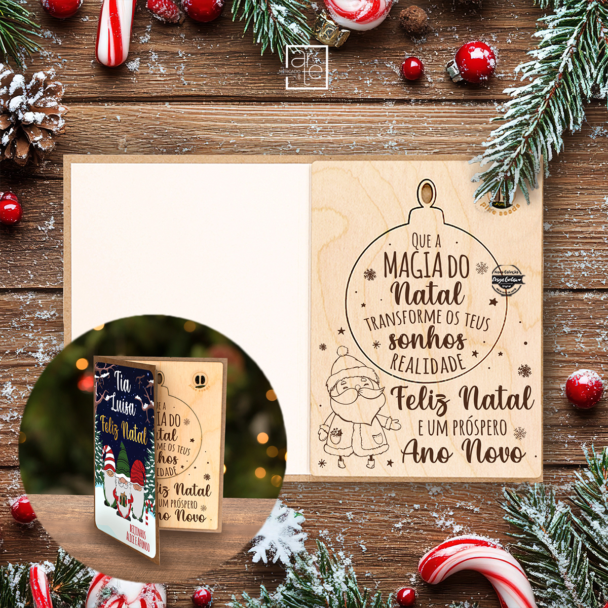✔️Postal de madeira personalizado na frente.