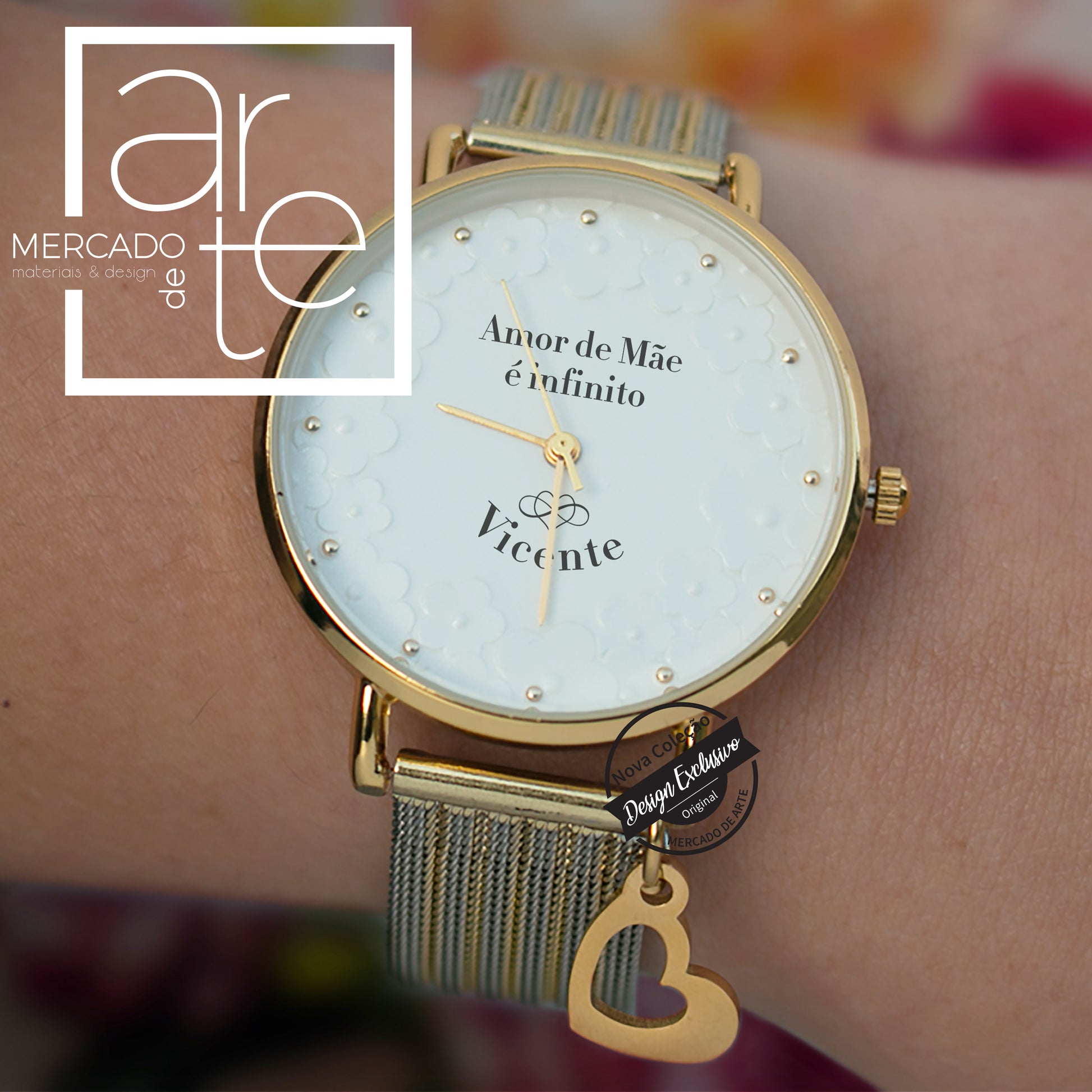 Relógio " Amor de Mãe é infinito " personalizável no mostrador, em aço inox e caixa incluida