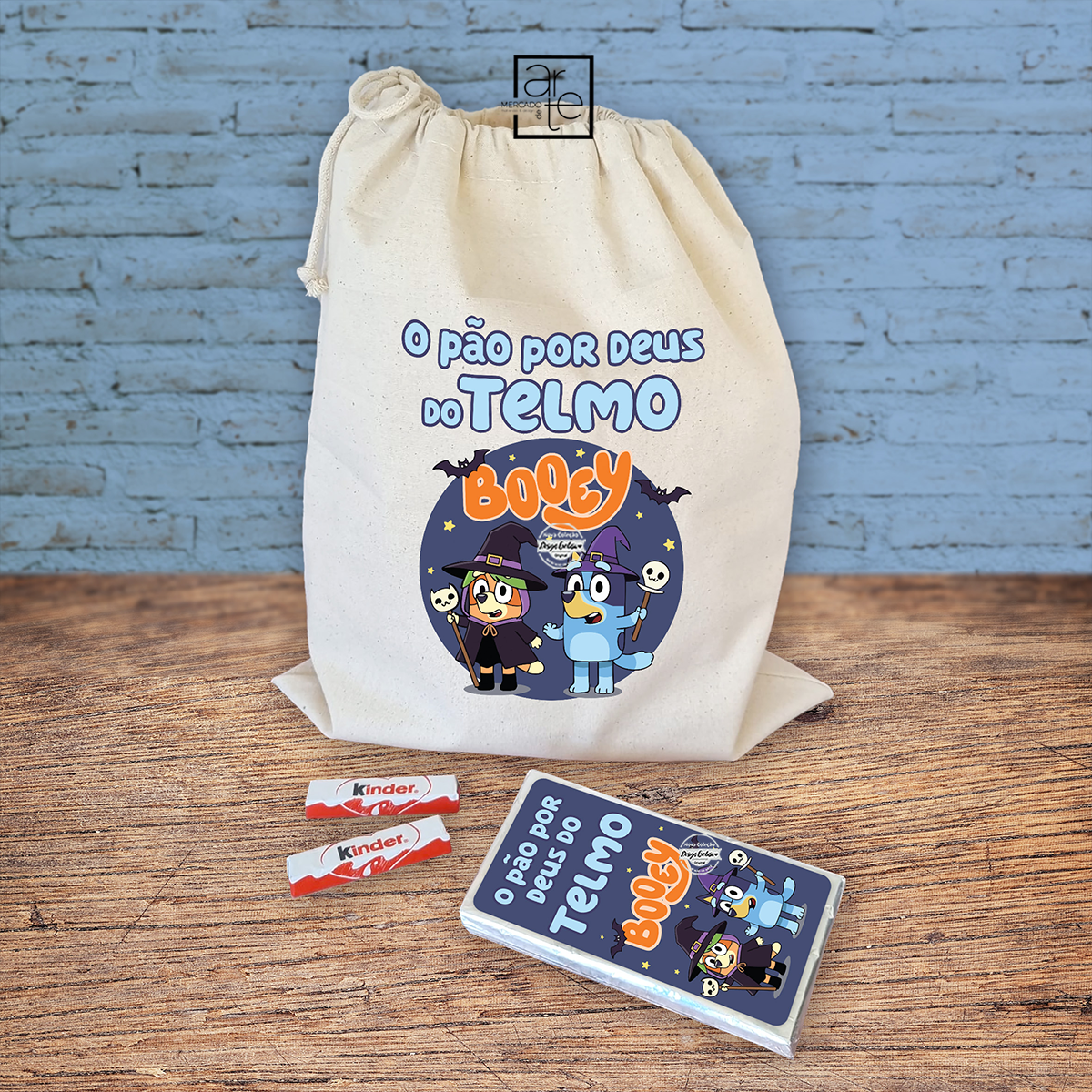Saco de tecido com medida 32x40cm. Tablete de chocolate de 100gr.
