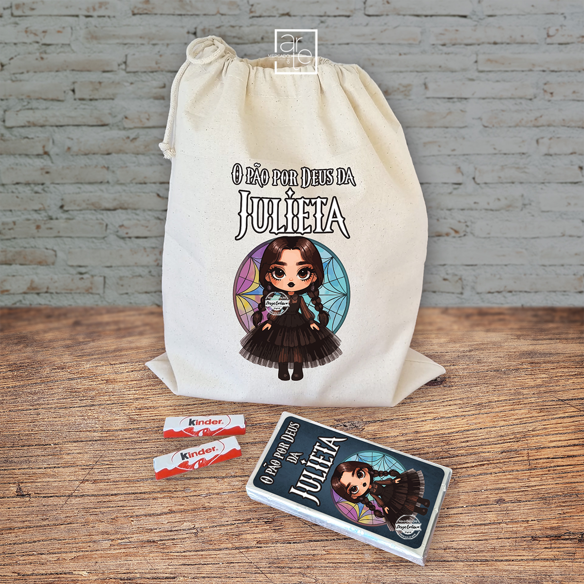 Saco de tecido com medida 32x40cm. Tablete de chocolate de 100gr.